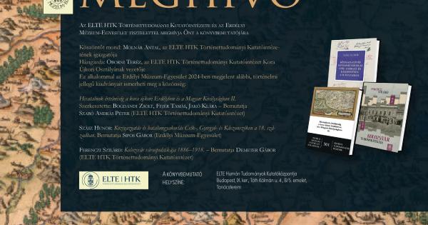 Az ELTE HTK Történettudományi Kutatóintézete és az Erdélyi Múzeum-Egyesület könyvbemutatót rendez 2025. október 16-án (csütörtökön) 11 órától.A könyvbemutató helyszíne: ELTE Humán Tudományok Kutatóközpontja, Budapest, IX. ker., Tóth Kálmán u. 4., B/5. emelet, TanácsteremKöszöntőt mond: Molnár Antal, az ELTE HTK Történettudományi Kutatóintézetének igazgatójaHázigazda: Oborni Teréz, az ELTE HTK Történettudományi Kutatóintézet Kora Újkori Osztályának vezetője