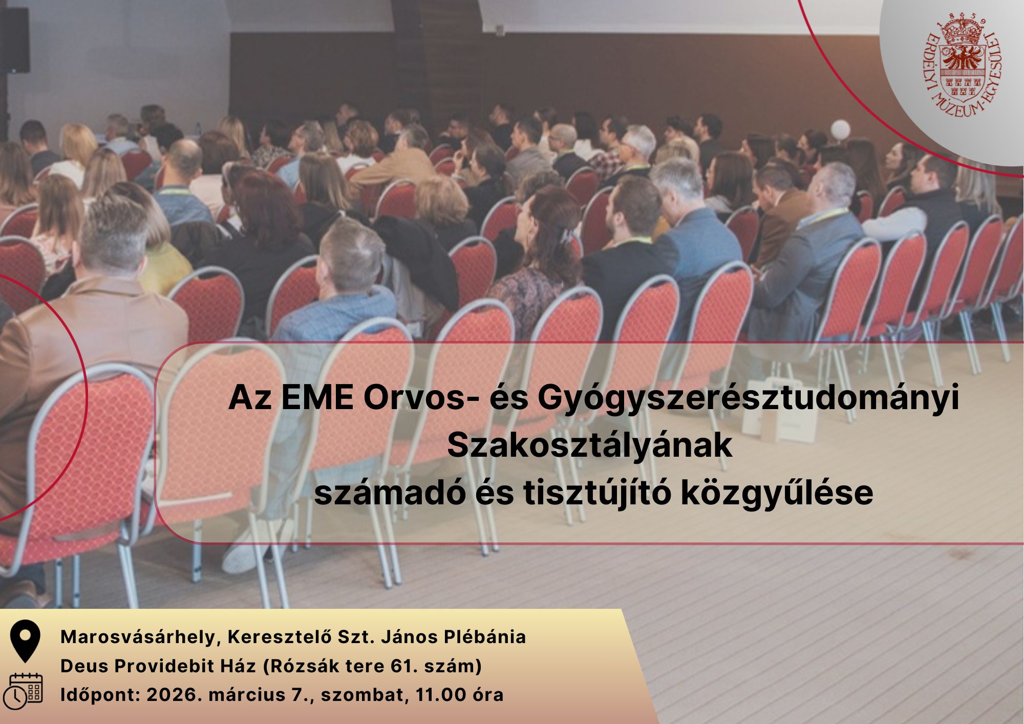 Az EME Orvos- és Gyógyszerésztudományi  Szakosztálya éves közgyűlésére 2026. március 7-én (szombaton ) 11 órakor kerül sor  Marosvásárhelyen, a Keresztelő Szt. János Plébánia Deus Providebit Házában (Rózsák tere 61. szám).