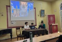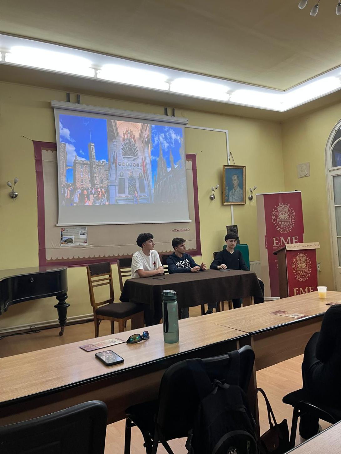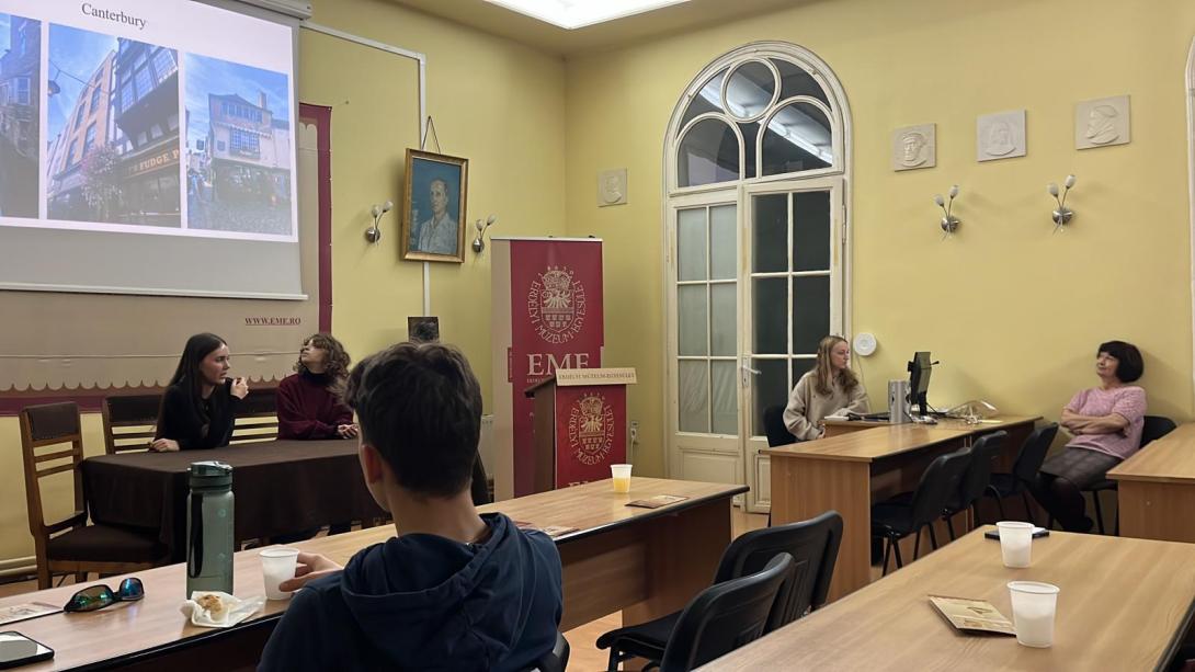 A képes beszámolókból (az elmúlt két év Egyesült Királyság-beli vakációs programról) kerekasztal beszélgetés lett ez év december 3-án az Erdélyi Múzeum-Egyesület Rhédey-ház-beli előadótermében, amikor a Báthory István Elméleti Líceum néhány X-es és XI-es diákja, angoltanáruk, Ilyés Hajnalka vezetésével az EME I., Bölcsészet-, Nyelv- és Történettudományi Szakosztálya vendégeként megosztotta élményeit, felismeréseit a hallgatósággal ez év december 3-án. Katedrálisok, kastélyok és városfények címet adtak beszámolójunak, amelyet a beharangozóban így summáztak: „Nyugodt tegerparti városkák és a pezsgő mindennapjairól híres főváros, történelmi helyek és legendákkal teli kastélyok”. A táborozás báthorys résztvevői közül nem tudott mindenki eljönni, de igazán meggyőző volt az a mód, ahogyan a látottakat művészettörténeti, történeli ismeretekkel, saját értékrendjükre is utalva értelmezték. Ferenczi Norbert, Molnár Melinda, Mudure Ingrid, Szakács Norbert és Virág Nimród nemcsak vakációs élményként, hanem kulturális tanulmányútként idézte fel a az idén Skóciában, a tavaly Angliában közvetlenül tapasztaltakat. A közönségből érkezett kérdések elsősorban a nyelvhasználatra, a környezetpolitikára, a kommunikációs szokásokra,a tanulás feltételeire vonatkoztak.