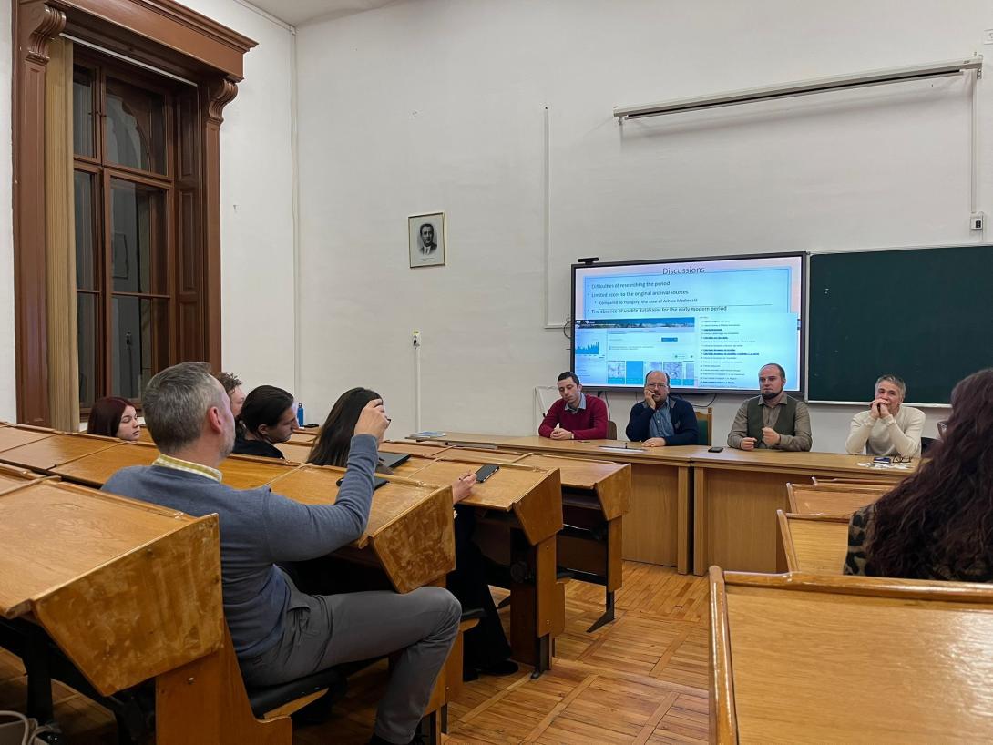 A BBTE Történelem és Filozófia Karán működő Hadtörténeti munkacsoport (Grupul de Lucru pentru Istorie Militară) és a Középkor és kora újkor szakkör (Cercul de Istorie Medievală și Premodernă) keretein belül került sor egy kerekasztal beszélgetésre a késő középkori és kora újkori források kutatásának nehézségei, valamint a mohácsi csatához kapcsolódó kutatási újdonságok témákban. A rendezvényen munkatársaink, Izsán Csaba és Hegyi Géza bemutatták a Jakó Zsigmond Kutatóintézet tevékenységét, illetve levezették a beszélgetést, amelyen a kar diákjai mellett részt vettek C. Tóth Norbert, az ELKH-MNL-SZTE Magyar Medievisztikai Kutatócsoport vezetője, Vlad Popovici és Cosmin C. Rusu, a BBTE Történelem és Filozófia Karának oktatói, Horváth Csaba független kutató, valamint Ciurica Matei, a kolozsvári Mareşal Constantin Prezan Hadtörténeti Múzeum munkatársa.