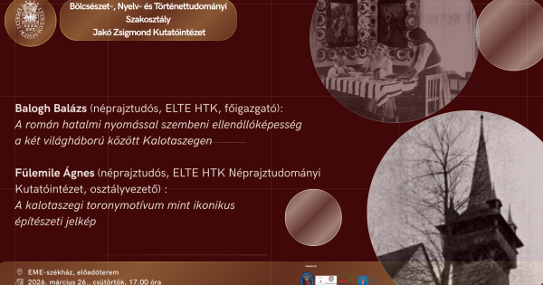 Az Erdélyi Múzeum-Egyesület Bölcsészet-, Nyelv- és Történettudományi Szakosztálya és a Jakó Zsigmond Kutatóintézet szeretettel meghív minden érdeklődőt Balogh Balázs, az ELTE HTK főigazgatója és Fülemile Ágnes, az ELTE HTK Néprajztudományi Intézetének osztályvezetője kalotaszegi kutatásaikkal kapcsolatos előadásaira.