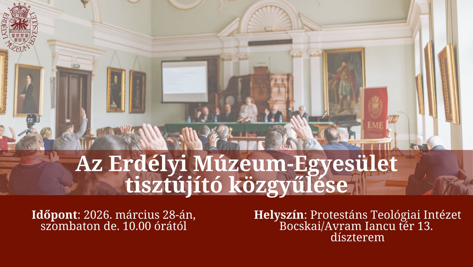 Az Erdélyi Múzeum-Egyesület Elnöksége tisztelettel meghívja Önt az Egyesület tisztújító közgyűlésére, amelyet Kolozsvárott tartunk a Protestáns Teológiai Intézet (Bocskai/Avram Iancu tér 13.) dísztermében 2026. március 28-án, szombaton de. 10 órai kezdettel.