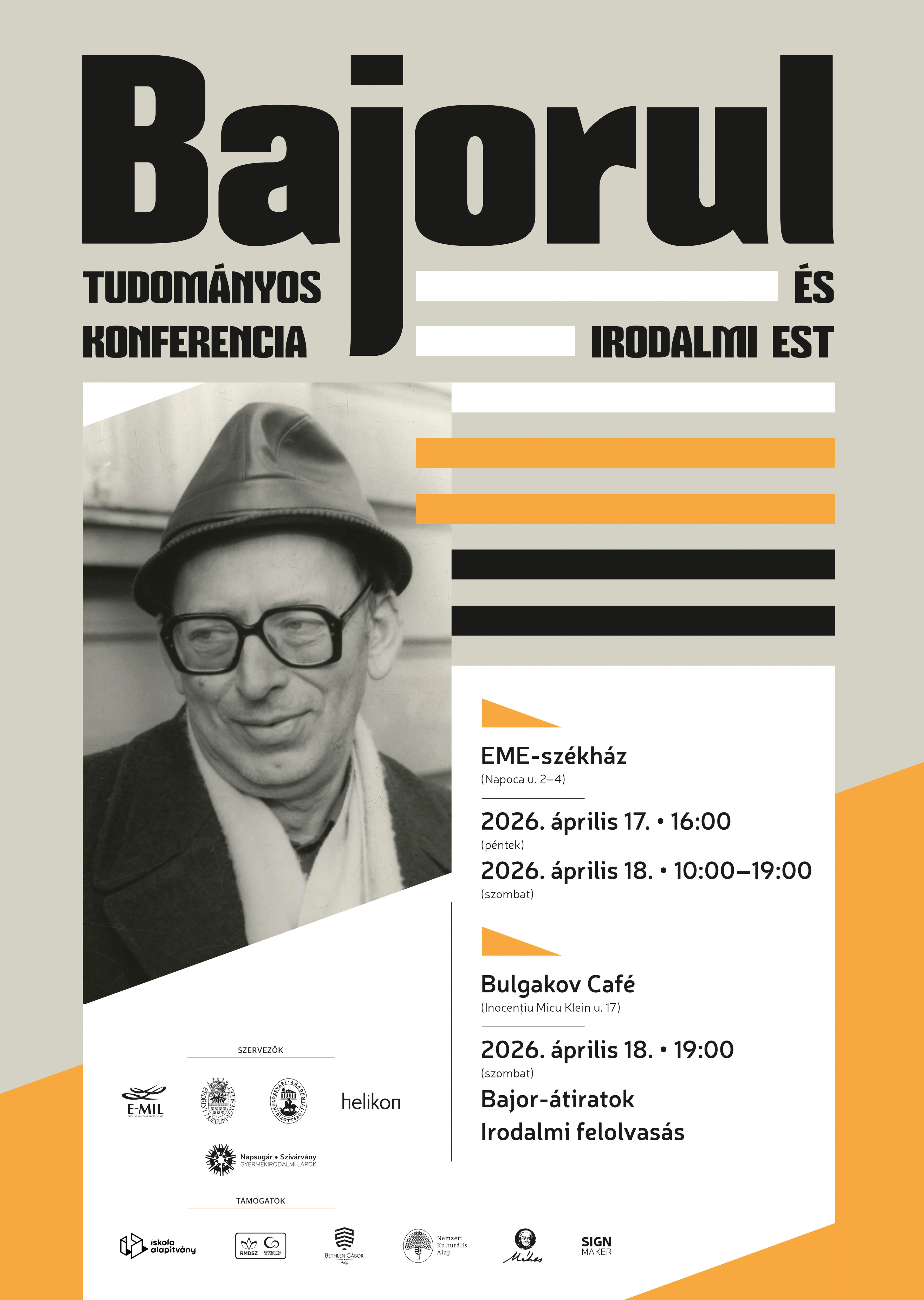 19: Bajor-átiratok. Irodalmi felolvasás vacsorával egybekötve: Bajor-átiratokkal Borcsa Imola, Botházi Mária, László Noémi, Mátyus Melinda, Marcutiu-Rácz Dóra, Sánta Miriám, Szabó Róbert Csaba, Szántai János, Varga László Edgár, Vermesser Levente, Vincze Ferenc–Márton Evelin és Zsidó Ferenc jelentkezik.