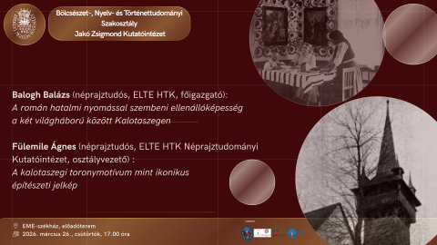 Az Erdélyi Múzeum-Egyesület Bölcsészet-, Nyelv- és Történettudományi Szakosztálya és a Jakó Zsigmond Kutatóintézet szeretettel meghív minden érdeklődőt Balogh Balázs, az ELTE HTK főigazgatója és Fülemile Ágnes, az ELTE HTK Néprajztudományi Intézetének osztályvezetője kalotaszegi kutatásaikkal kapcsolatos előadásaira.
