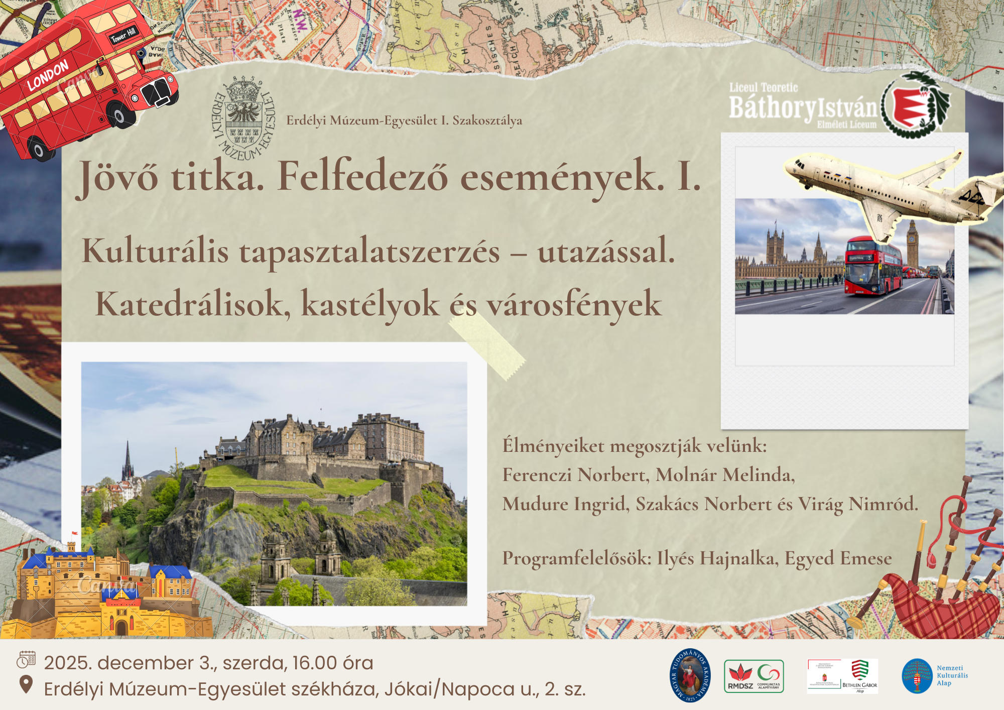 A Báthory István Elméleti Líceum diákjai és az Erdélyi Múzeum-Egyesület I. Szakosztálya közös rendezvényt szervez „Jövő titka. Felfedező események. 1” címmel, ahol a résztvevők beszámolót hallhatnak a diákok angliai és skóciai tanulmányútjáról.