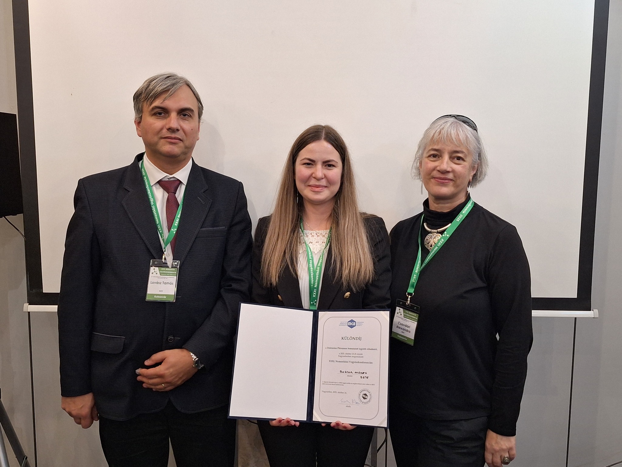 A Magyar Kémikusok Egyesülete (MKE) különdíjjal jutalmazta Bogyor Andreát, a Babeș–Bolyai Tudományegyetem (BBTE) doktoranduszát és az Erdélyi Múzeum-Egyesület külső kutatócsoportjának tagját a XXXI. Nemzetközi Vegyészkonferencián, amelyet 2025. október 23–25. között rendeztek meg Nagyszebenben.
