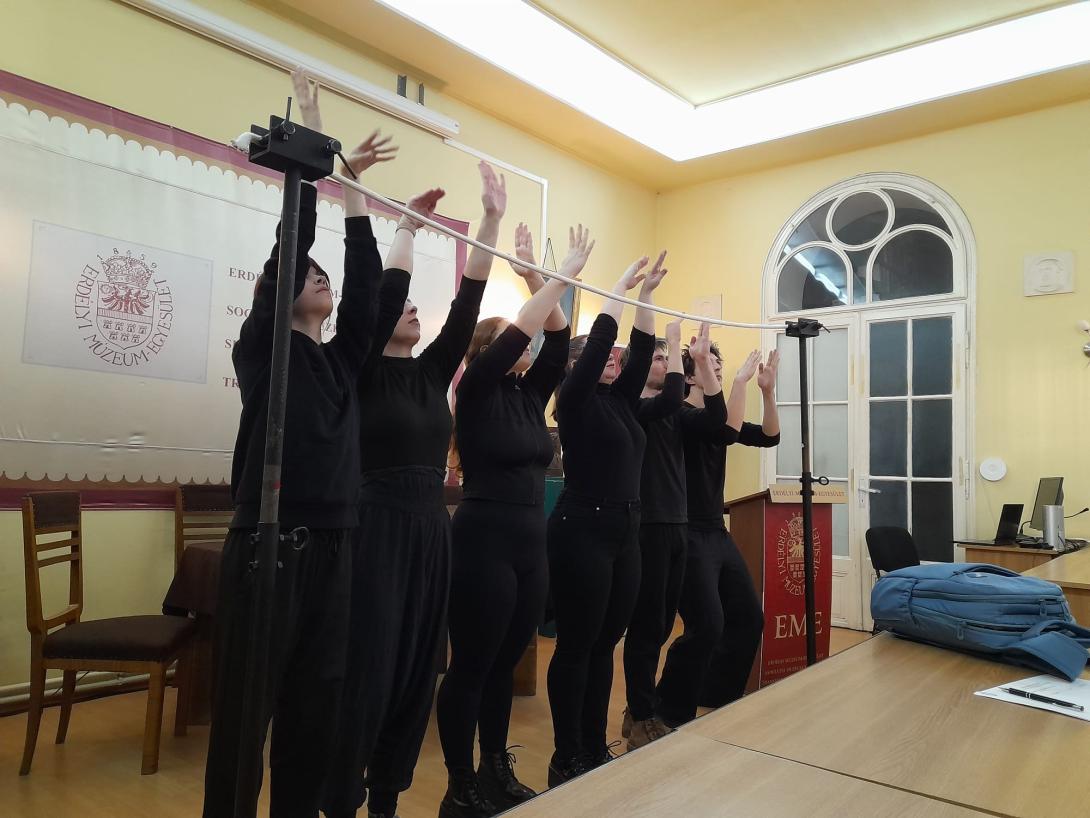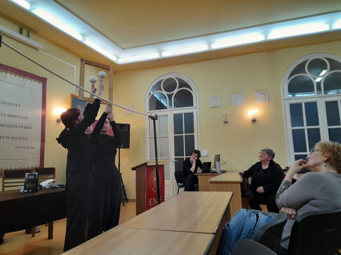 2026. február 25-én emlékezetes könyvbemutatón vett részt az érdeklődő közönség az EME Bölcsészet-, Nyelv és Történettudományi Szakosztálya, az MTA KAB Színháztudományi Szakbizottsága és a BBTE Magyar Színházi Intézete társszervezésében sorra kerülő eseményen. A Marosvásárhelyi Művészeti Egyetem másodéves bábszínész szakos hallgatói, Garaczi Rebeka, Kerekes Dorka, Kőrösi Áron, Szabó Tekla, Szalai Glória, Szilágyi Barnabás a képzeletbeli paraván leplezésében izgalmas etűdökkel vezették be a közönséget a kézjátékok világába. Azt a közösségiséget, a látás útján felfogható, de a test, a kéz és az anyag által színre vitt, váratlan megoldásokat és összefüggéseket kínáló világot érzékeltették gyakorlatban, amelyet az egyetemi oktató, teatrológus, bábművész Novák Ildikó legújabb könyvében értelmez. Novák Ildikót a Bábszínházi és színházi látleletek című, 2025-ben Kolozsvárt megjelent kötetéről munkatársa, a színházi szakíró Ungvári-Zrínyi Ildikó kérdezte. Az újabb bábjátékos etűdökkel tarkított beszélgetés a műfaj elméleti kérdéseit, hazai és külföldi oktatását, módszertanát, a gyakorlati és elméleti téren egyaránt működő szerző jártasságát, tapasztalatait érintette, a szakmabeliek, a műfajt tanulmányozó és iránta érdeklődő közönség figyelmébe ajánlva e hasznos kiadványt.